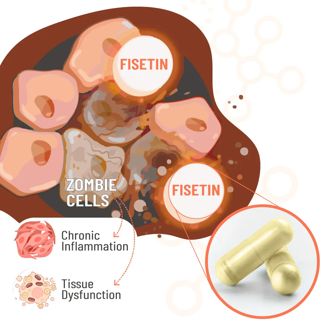 Fisetin helps eliminate senescent cells, also known as "Zombie cells." These cells accumulate with age, causing inflammation and impairing cellular function, which can increase the risk of age-related diseases.